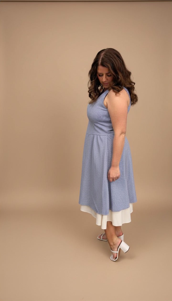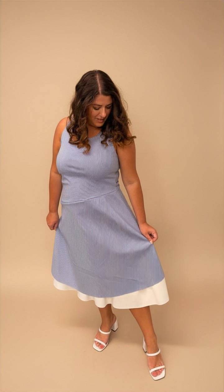 un tissu supérieur à rayures bleues pour le caractère, et une base blanche pour la fraîcheur et la lumière. Le résultat ? Une robe qui attire le regard sans en faire trop.
